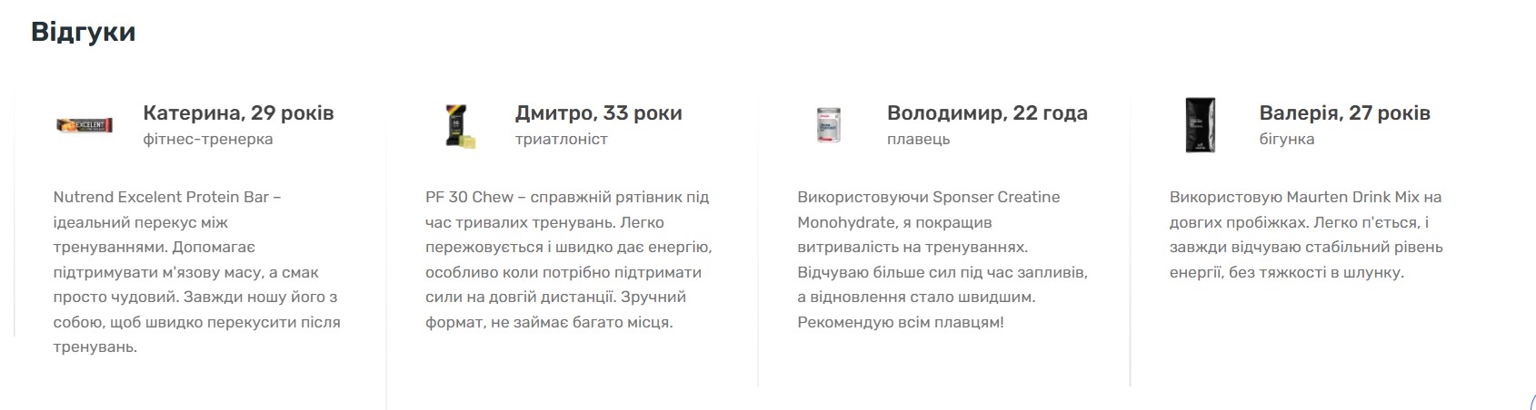 A block with reviews from athletes of different sports has been added. Where the product, sport (which the athlete is engaged in), age and his feedback on this sports nutrition is indicated.