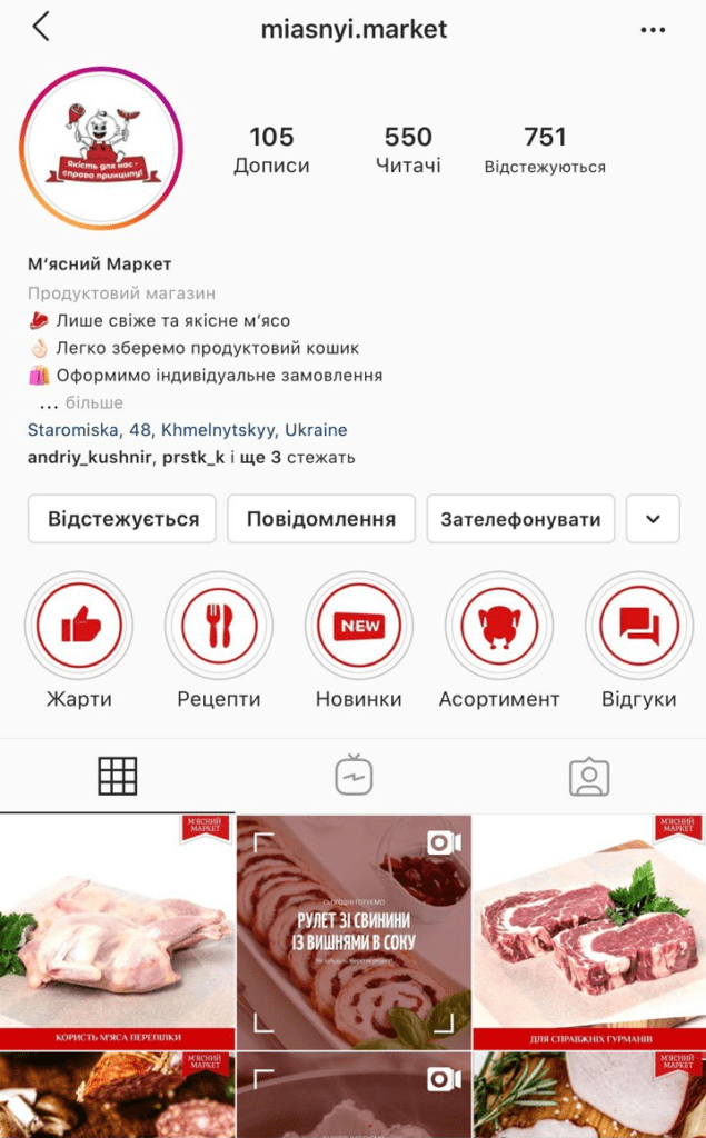 The main aim of guiding the page is to make the brand more popular. That is why we made the style of the “Miasnyi Market. Khimilnyk” similar to that of “Miasnyi Market” Khmelnytskyi’s account. The name of the page, profile photo and covers for the actual stories of these two accounts are common. Besides, we added the page description, action buttons, store address and contacts.
