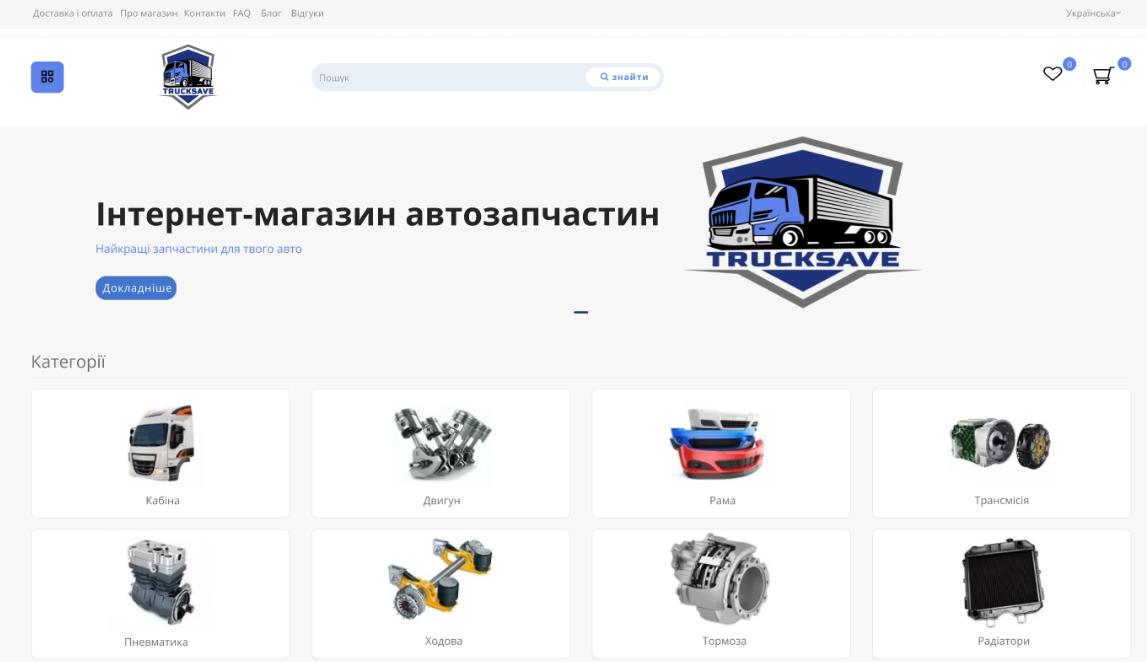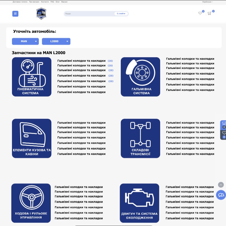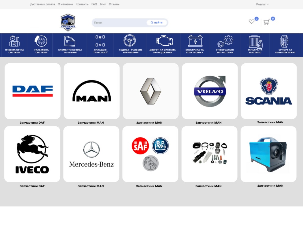 After filling out the client’s brief, designers of our company analyzed the main wishes of the client and began to create the layout of the site in accordance with the main objectives, namely the sale of auto parts for trucks.
