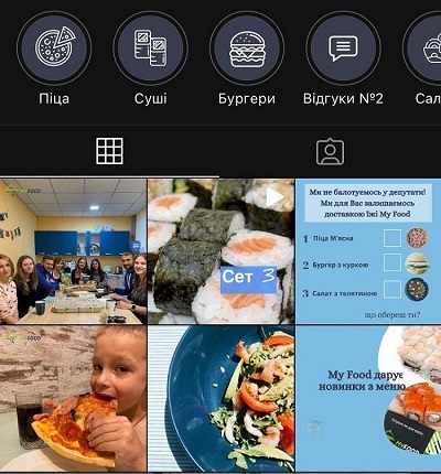 Назва кожної підбірки не повинна перевищувати 10-12 символів та має бути цілком зрозумілою для користувачів. Ви можете поділити історії на розділи “Акції”, “Доставка”, “Оплата”, “Проекти”, що спростить пошук необхідної інформації для користувачів.